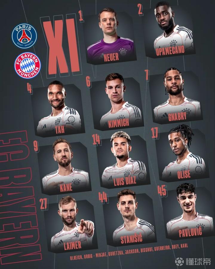 拜仁首发阵容如下:1号诺伊尔、27号莱默尔、2号于帕梅卡诺、4号约纳坦-塔、44号斯塔尼希奇、45号帕夫洛维奇、6号基米希、7号格纳布里、14号路易斯-迪亚斯、17号奥利塞以及9号凯恩!